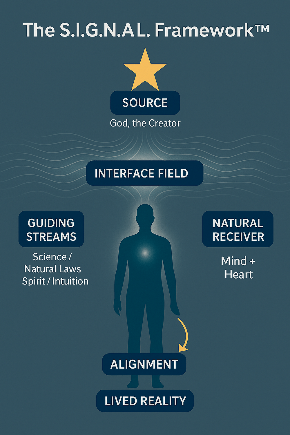 The S.I.G.N.A.L. Framework™ reveals this pattern in a simple, practical way. It shows the full journey of divine guidance—from God as the Source… through the unseen spiritual field around you… into your intuition, thoughts, emotions, and awareness… and finally into the real decisions and experiences of your daily life.